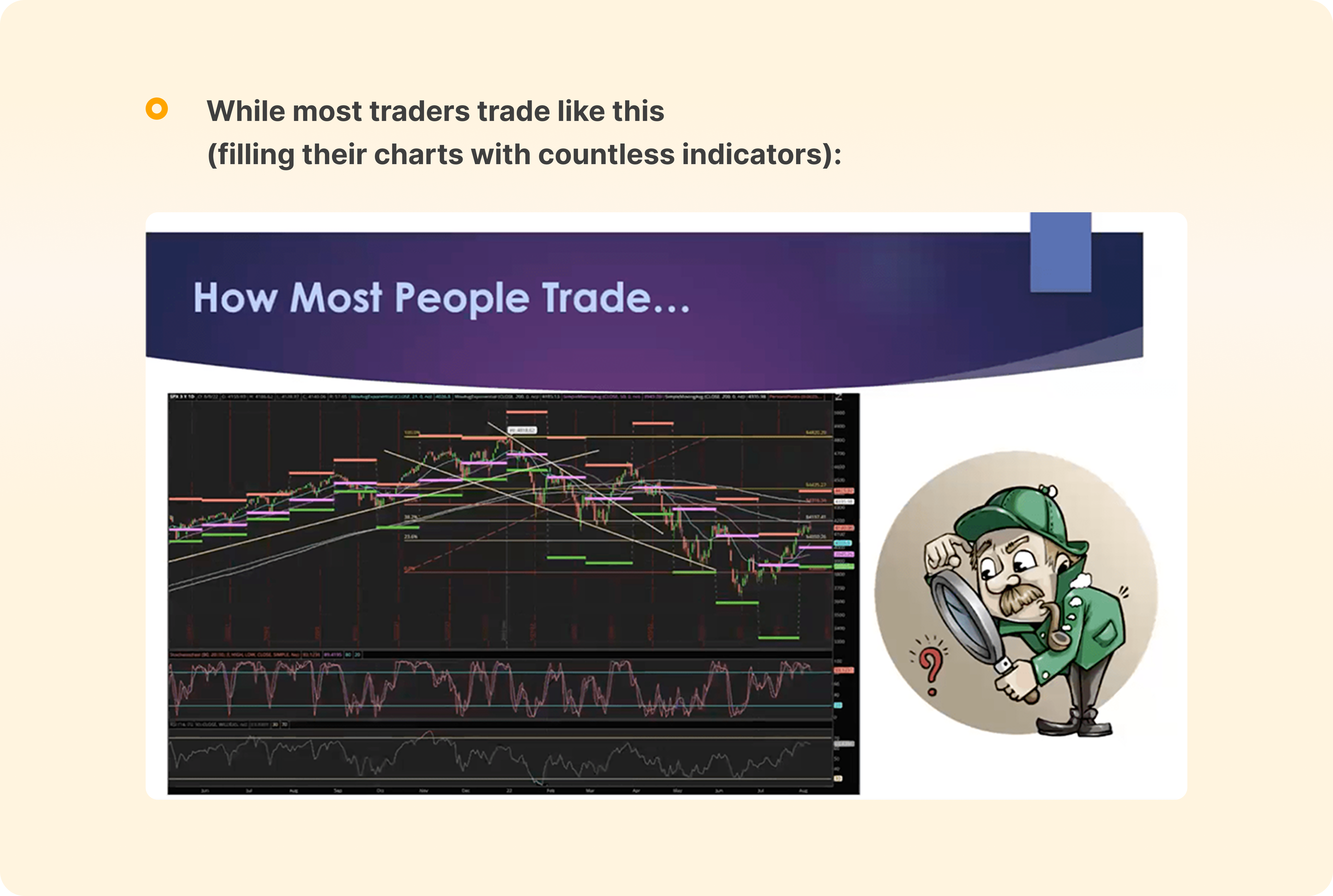 As a corporate banker, I DON’T have the luxury of time to look at charts all day. Hence, I distilled all the strategies, systems, and tactics into a 60-minute Trading Ritual. While most traders trade like this (filling their charts with countless indicators):