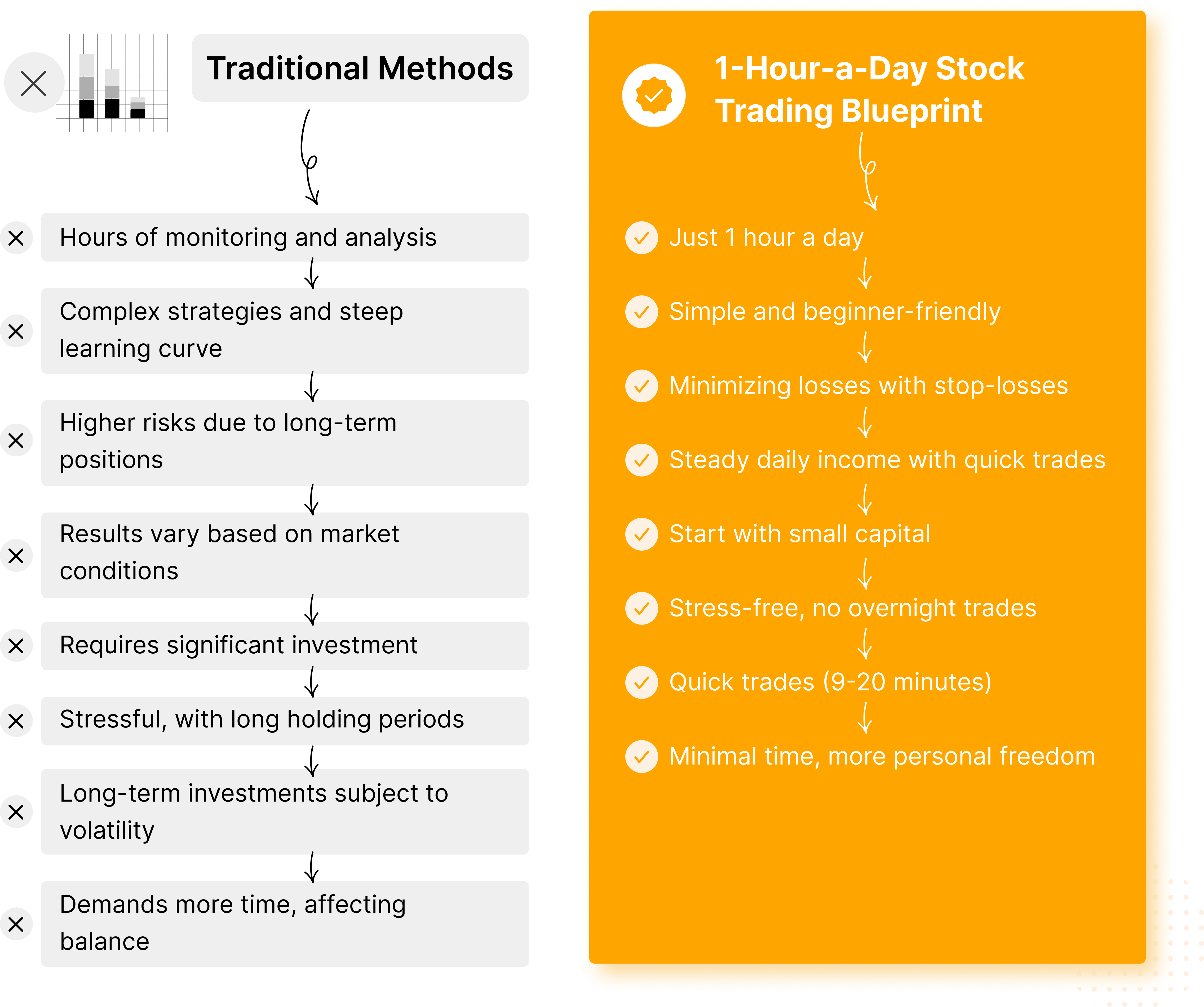 This masterclass is designed with beginners in mind. The 1-Hour-a-Day Stock Trading Blueprint simplifies trading into a step-by-step system that anyone can follow, even with no prior experience. You'll learn the essentials to start trading confidently and effectively.