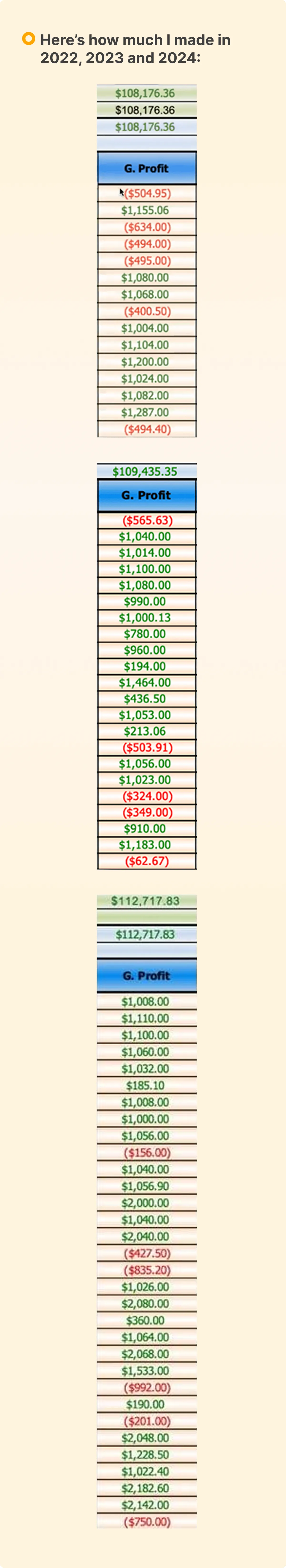 In 2022, I had 166 winning trades and 74 losing trades – making $108,000 in 12 months. And I duplicated similar results in 2023 & 2024.